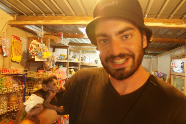 Les plantes poussent au coeur du lac aux eaux sombres et le ciel se fait de plus en plus menaçant jusqu’à ce que des éclairs le déchirent. Nous restons un moment à contempler le spectacle avant de rentrer : la pluie n’est plus très loin. Nous faisons une halte à l’unique épicerie du village, dans une petite maison et prenons à boire. Il y a de la bière et même de la Guiness ! Nous ne pouvons résister. Alors que nous allons payer, un garçon arrive avec un bébé singe en couche ! Il est adorable. Nous demandons comment il s’appelle et la réponse nous fait bien rire : Niko !