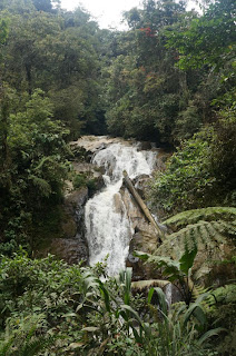 Après une bonne heure de marche, nous tombons sur un petit mot, déposé par un randonneur qui tient à prévenir que les 700 derniers mètres sont très difficiles, particulièrement quand il a plu et qu’il faut être prudent. Nous comprenons rapidement pourquoi. Le chemin est escarpé, glissant. Des troncs bouchent le chemin nous forçant à les escalader, sans prise réelle et parfois à sauter car ils sont hauts. Nous sommes trempés et couverts de boue. J’ai peur un temps qu’il y ait des sangsues mais heureusement ce n’est pas le cas et seul un insecte étrange s’invite sur ma main avant que je ne le chasse dans un grand sursaut.