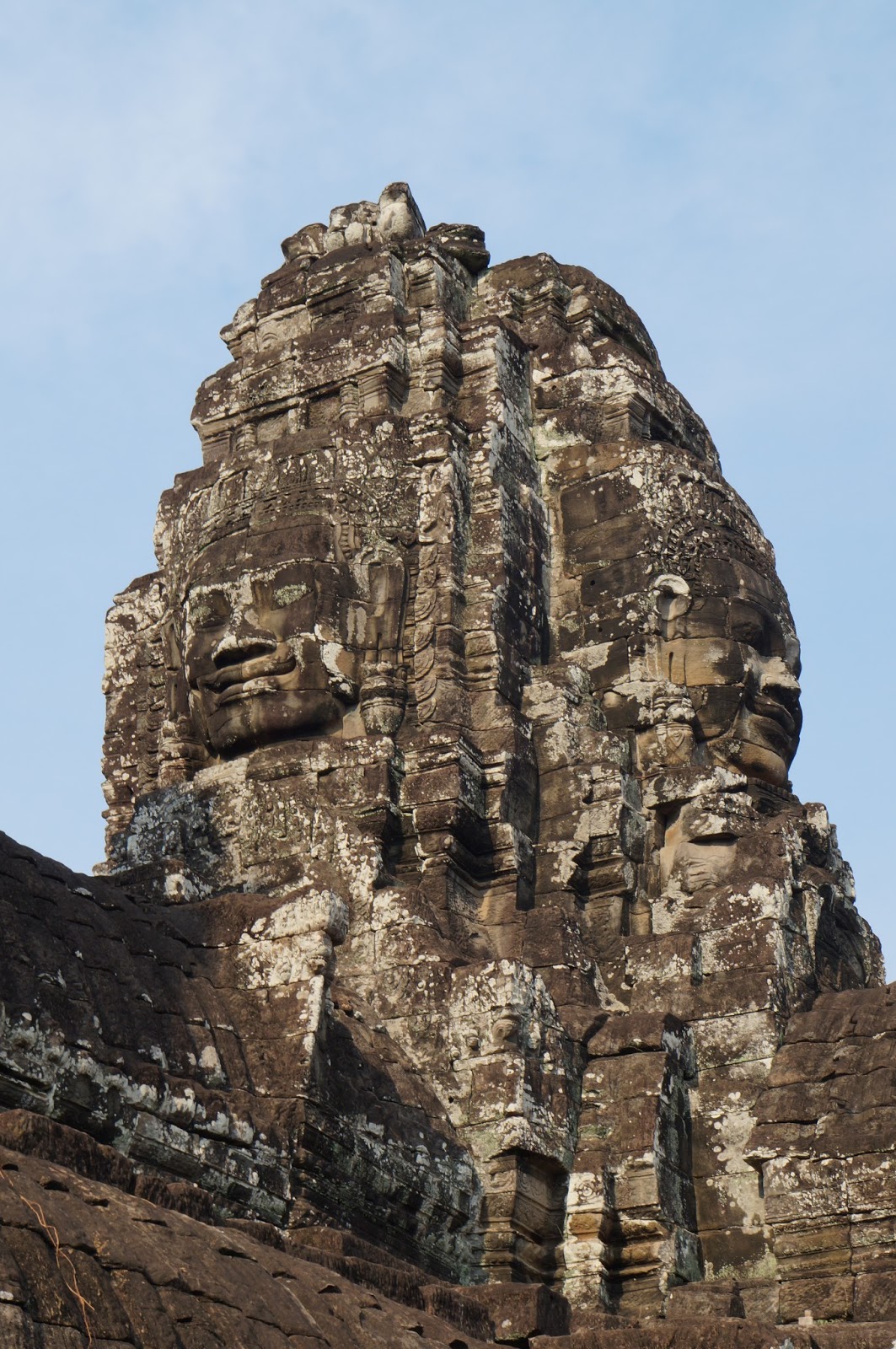 Nous partons ensuite dans Angkor Thom qui, à la différence des autres lieux, était également une ville. Nous allons au Bayon, un temple très impressionnant. Les tours sont constituées de visages en pierre qui ont une étrange familiarité avec les images que nous avons pu voir des temples d’Amérique du sud ou même des statues de l’île de Pâques. Le lieu est un véritable labyrinthe. Nous en réservons la visite complète aux jours suivants car nous voulons voir le soleil se coucher.