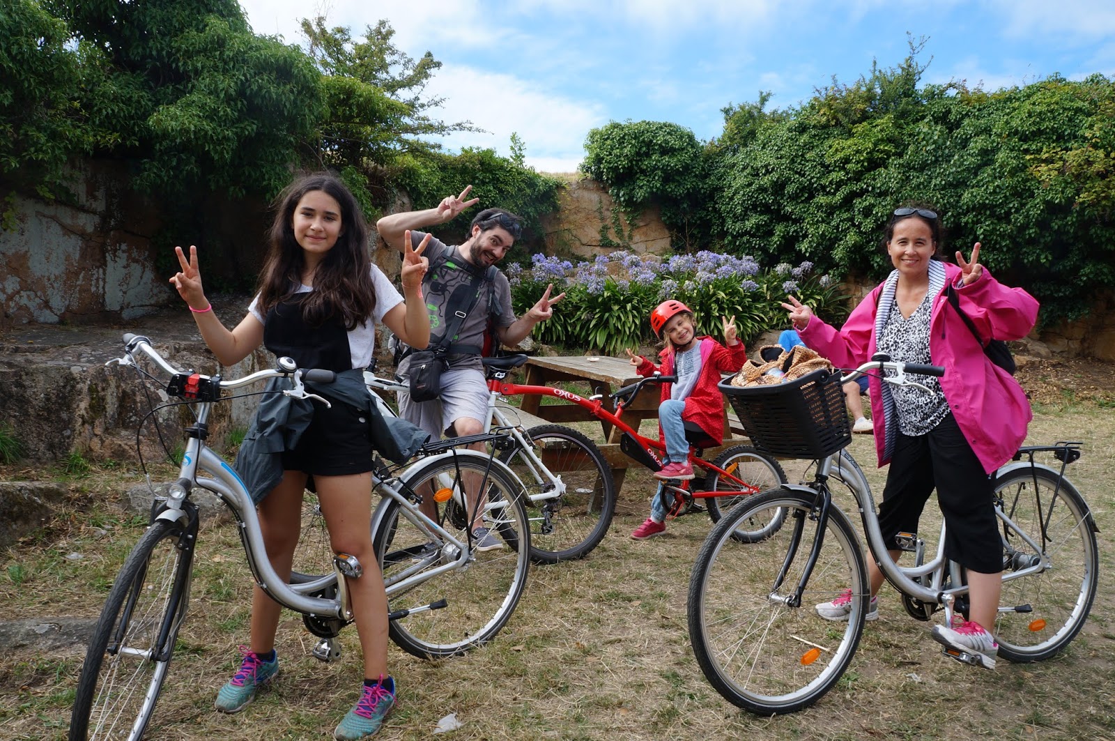Notre ambition étant de visiter l’île à vélo, nous nous ruons vers le premier loueur que nous trouvons : Bréhat location. Et quand la chance est de votre côté, elle ne vous lâche pas ! Nous obtenons les derniers vélos ! Le service n’est pas hyper chaleureux mais les vélos sont de bonne qualité. Nous mettons Elliot dans un siège à l’arrière de mon vélo et Roxane, notre nièce âgée de cinq ans est à l’arrière du vélo de Nico, comme avec un tandem version enfant quoi !